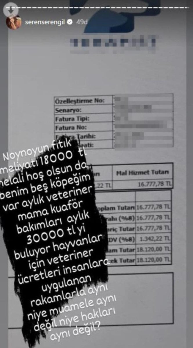 Instagram hesabından köpeğinin tedavi masraflarının yer aldığı makbuzu yayınlayan Seren Serengil, “Noynoy’un fıtık ameliyatı 18 bin TL. Helali hoş olsun da benim beş köpeğim var aylık veteriner, mama, kuaför bakımları 30 bin TL’yi buluyor. Hayvanlar için veteriner ücretleri insanlara uygulanan rakamlarla aynı, niye muamele aynı değil? Niye hakları aynı değil?” diyerek sitem etti.